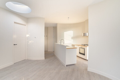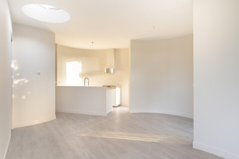 The apartment is accessible through a gated fence, where one can park bikes next to the path which leads to the front door and west-facing communal garden. The hallway leads to the toilet and bathroom. Afterwards, you are welcomed by the spacious open floor plan kitchen and living room with its unique, curved lay-out and ceiling window, providing a wealth of natural sunlight. The kitchen is equipped with oven, a four burner gas stove, dishwasher and fridge.  From the living room, one can enjoy privacy on the balcony-like, south-west facing back patio, as well as the bedroom.