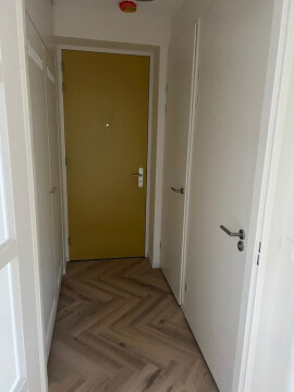 • Voordeur appartement, ruime hal, opslagkast voorzien van wasmachine en meterkast