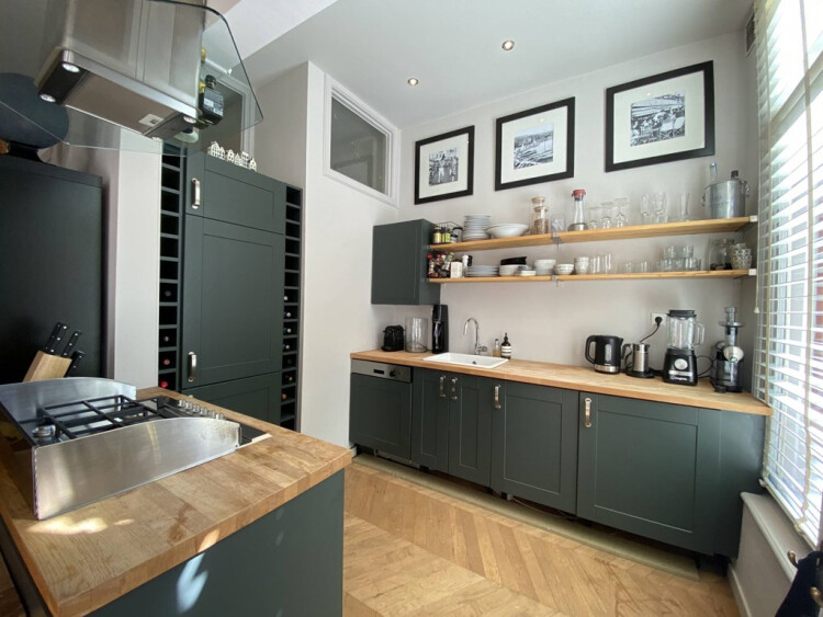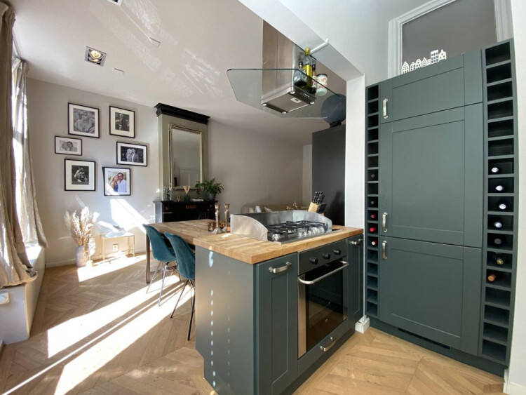 Open woon / eetkamer aan voorzijde met openslaande deuren naar gezellig en zonnig frans balkon. Open keuken met kookeiland van alle gemakken voorzien.