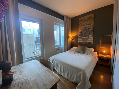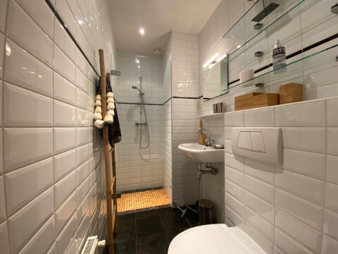 Ruime slaapkamer met inbouwkast aan achterzijde met toegang tot het balkon. Badkamer eveneens aan achterzijde met wastafel, toilet en inloop douche.