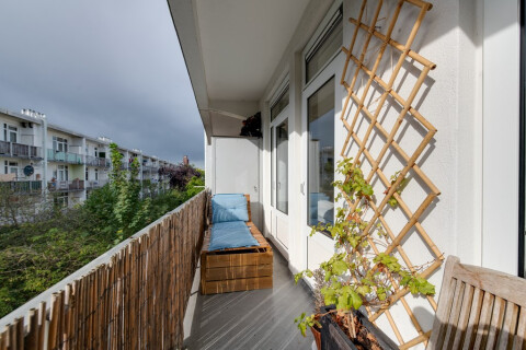 De slaapkamer is aan de achterkant van het appartement, waardoor het hier heerlijk rustig is. De slaapkamer biedt voldoende ruimte voor een tweepersoonsbed en een kast. Grenzend aan de slaapkamer is diep en zonnige balkon gesitueerd. Tevens is hier ruimte voor de droger gerealiseerd.
