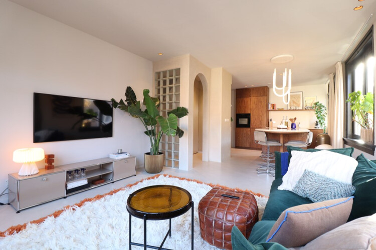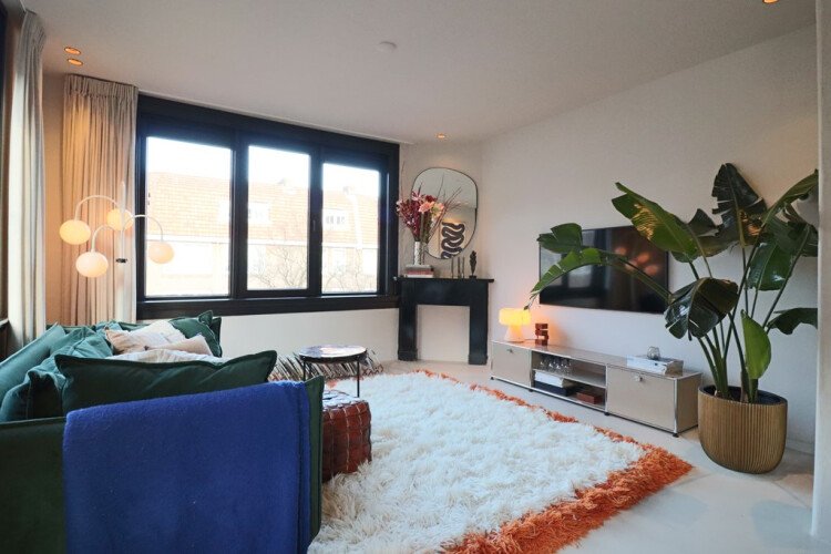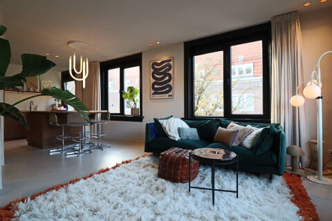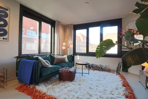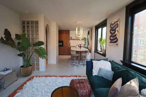 Amazing renovated 90m² one bedroom apartment with high end finishing and furniture. The renovated apartment is designed by an architect and equipped with luxury appliances. The lay out is very special, beacause the open livingroom and kitchen are situated on the second floor of the building. Next to the kitchen is the dining room. In the hallway is the separate toilet and there is hidding storage / cupboard space all over the place. On the third floor is the bathroom, laundry space and huge clothing closet, and on the top floor is the bedroom with separate bathtub.