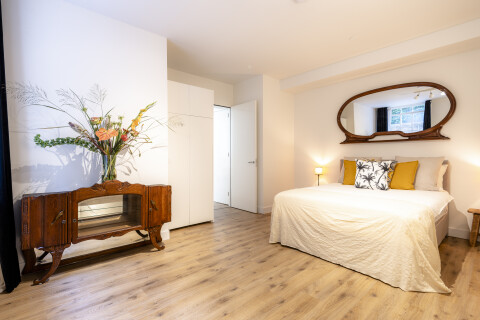 A brand new interior with wooden oak floor, 1 large double sized boxspring bed with luxury memory- foam mattress, incl. storage space underneath and new bed linen, sheets and pillows, (EXTRA SLEEPING SPACE POSSIBLE BY ADDIND 1 BED OR SLEEPERCOUCH), a wardrobe for clothing and additional storage space, all lighting installed, a modern kitchen with generous cupboard space and custom made pantry, all cooking utensils, an automatic dishwasher, integrated refrigerator, a 4- flame gas cooker, Nespresso coffee machine and water boiler, basic crockery and cutlery, dining room table with 6 chairs, a book cabinet, washing machine and fully equipped housekeeping cabinet, luxury curtains, central heating and a sublime WiFi connection. Also; double doors opening to an outside terrace on a pedestrian- only street, with a brand new bathroom including spacious shower, washbasin, wc and automatic ventilation system.