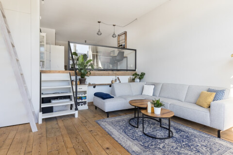 De leefruimte is bijzonder en verdeeld over een woongedeelte op de begane grond én keuken- en slaapgedeelte een halve verdieping hoger gelegen, wat een prettige ruimtelijke sfeer creëert. Alle woonfuncties, keuken, eethoek, zithoek en slaapkamer bevinden zich in één ruimte. De grote hoge ramen maken van dit appartement een fijne plek en hierdoor voelt het appartement veel ruimer. De woning is volledig gestoffeerd en voorzien van een prachtige onbewerkte houten vloer en fijne verduisterende gordijnen en tevens is op de begane grond een hele wand voorzien van een strakke en praktische inbouwkast.