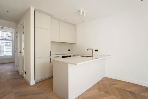 De keuken is een combinatie van mat lichtgrijze keukenfronten, een dun composiet zandkleurig werkblad met lichte aders waarin de spoelbak doorloopt. Een messing Quooker kraan maakt deze ton-sur-ton keuken helemaal af en zal het een eigen gezicht geven, dat naadloos aansluit bij de sfeer in de rest van het appartement.