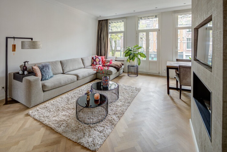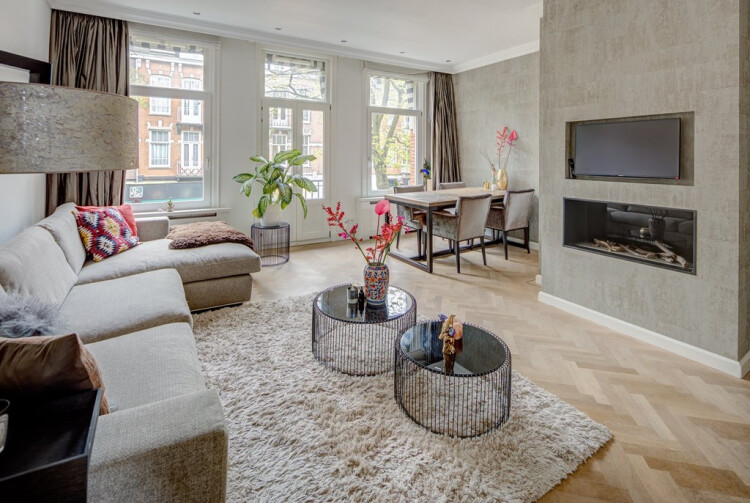 De woonkamer met half open keuken bevinden zich aan de voorkant. De voorzijde van de woonkamer is voorzien van een grote eettafel met vier stoelen. Het appartement is voorzien van een high-end inrichting. Aan de voorzijde is een klein frans balkon met openslaande deuren.