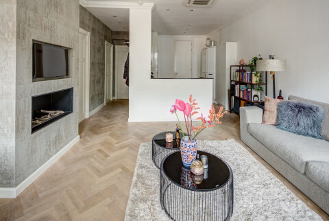 Middels de gemeenschappelijke trap, toegang tot het appartement op de eerste verdieping. Bij binnenkomst entree in de ruime en lichte woonkamer met half open keuken.