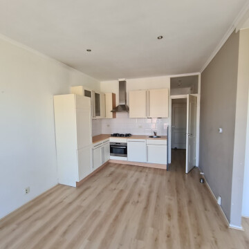 De woonkamer is aan de voorzijde van het pand gelegen en de openslaande deuren geven toegang tot een Frans balkon. Aan het eind is een open keuken gerealiseerd. De strakke keuken met een prachtig werkblad beschikt over inbouw apparatuur, waaronder een afzuigkap, een vaatwasser, een koel-vries combinatie, een combi oven-magnetron en een 4 pits kookplaat.