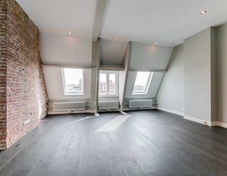 This beautifully renovated two-bedroom apartment combines modern comfort with authentic character. Fully refurbished just a few years ago with great attention to detail, the property features a spacious bathroom, a bright living area, and a distinctive design. The exposed brick wall and rust-toned kitchen add a bold, industrial edge, while the large windows and impressive 3.12 m ceilings flood the space with natural light. To complete the picture, a stunning private roof terrace offers sweeping views over Amsterdam’s skyline.