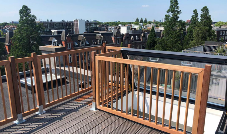 From the entrance hall, a staircase leads to the private roof terrace, offering breathtaking panoramic views of the city—including the Westertoren, Rijksmuseum, and Vondelpark.