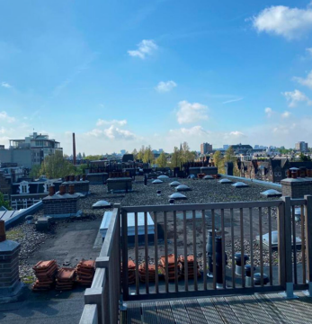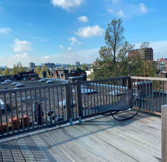 This beautifully renovated two-bedroom apartment combines modern comfort with authentic character. Fully refurbished just a few years ago with great attention to detail, the property features a spacious bathroom, a bright living area, and a distinctive design. The exposed brick wall and rust-toned kitchen add a bold, industrial edge, while the large windows and impressive 3.12 m ceilings flood the space with natural light. To complete the picture, a stunning private roof terrace offers sweeping views over Amsterdam’s skyline.