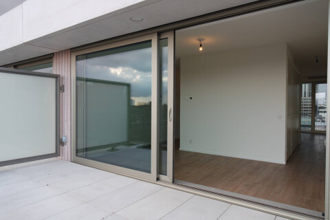Ruime woon/eetkamer met open keuken en grote schuifpui naar 15m2 terras op het zuiden.