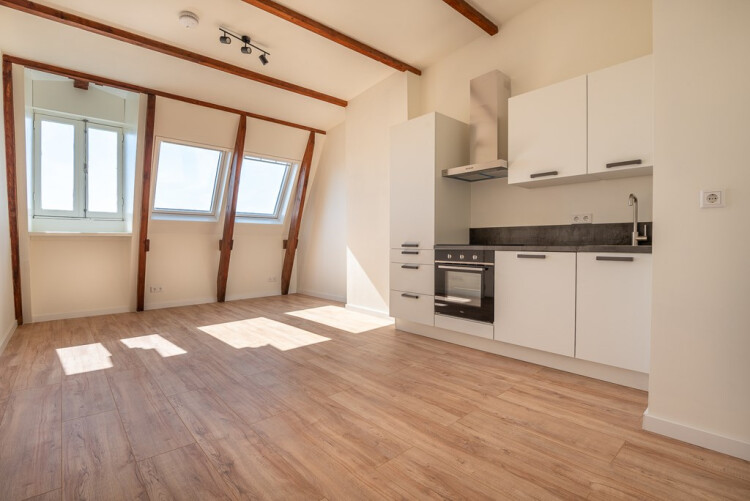 Ingang appartement op 4e verdieping, woonkamer met open keuken (v.v. diverse inbouwapparatuur), slaapkamer, moderne badkamer met douche, wastafel en toilet