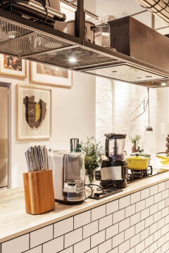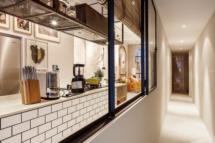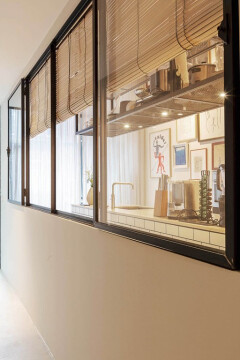 The spaces are separated by glass walls, opening the space and letting the light pass through the entire apartment.