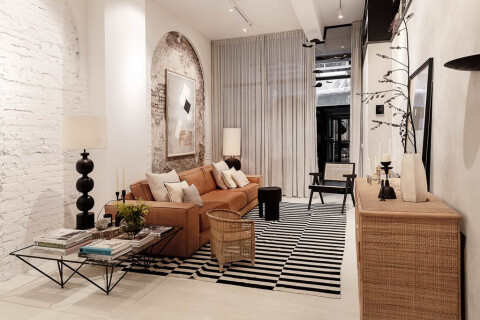 To access the rear apartment, you can walk through a hallway that goes from the front of the building or through a door halfway in the front apartment. You enter directly into the large open floor living room with a dining table and kitchen. Large windows in the ceiling let in a lot of light and give this loft a very private feeling. The authentic beams and design furniture make it a very cozy and comfortable home. The kitchen has a fridge/freezer, large oven, microwave, dishwasher, and induction hob. The apartment has an industrial seamless floor all over.