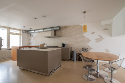 2e verdieping: Ingang; ruime, moderne eetkeuken v.v. diverse inbouw apparatuur, split-level naar de ruime woonkamer met frans balkon aan de voorzijde; trap naar beneden;