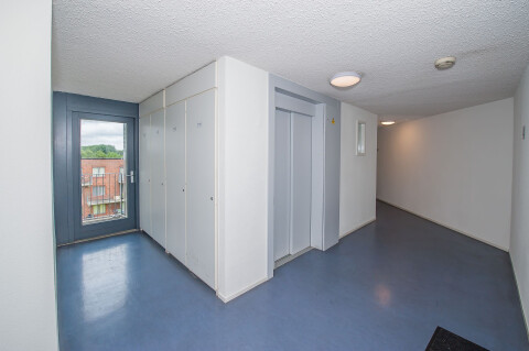 Na de entree kom je in de lange corridor met drie slaapkamers, de badkamer, het toilet en de woonkamer met deur naar de loggia. De woonkamer voorzien van nieuwe laminaatvloer heeft een grote lichtinval door de vele ramen. Dit geldt overigens voor het hele appartement. De woonkamer heeft een nieuw geplaatste keuken. Naast de keuken is een inpandige berging voor de wasmachine en de droger. Er is hier ook nog genoeg ruimte voor een grote stellingkast en een vriezer.