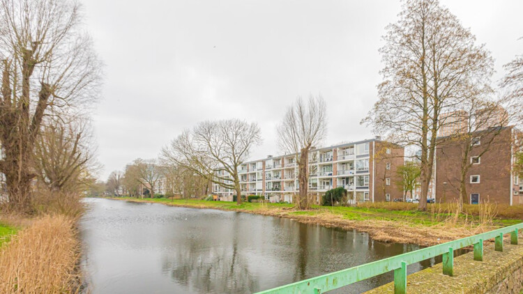 Stairs to 3rd floor; hall, spacious and bright living room with a beautiful view over the water, with access to the balcony, separate modern kitchen (equipped with various built-in appliances), two bedrooms, separate bathroom with shower, toilet, sink and with washing machine and dryer. Bicycle storage on the ground floor.