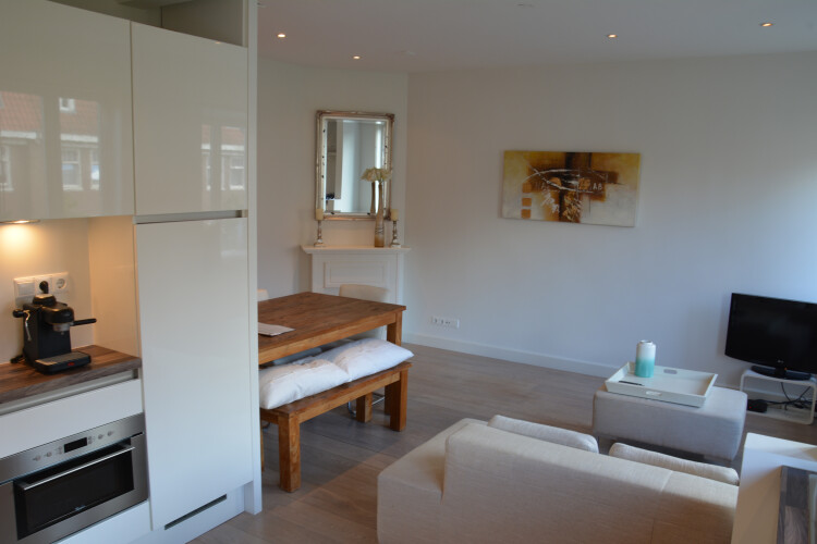 Layout: Entrance of the apartment on the third floor with intercom and access to the spacious living room with open kitchen. The very luxurious and new kitchen has a refrigerator, freezer, microwave, oven, steam oven, dishwasher and a 4 pits stove with extractor hood.