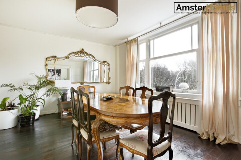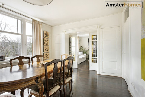 De ruime en lichte woonkamer is door ensuite deuren met glas in lood gescheiden van de eetkamer. De woonkamer is zeer comfortabel ingericht. De grote ramen bieden een wijds uitzicht over het Amstelkanaal. De eetkamer is voorzien van een klassieke eettafel en biedt plaats voor 6 personen.