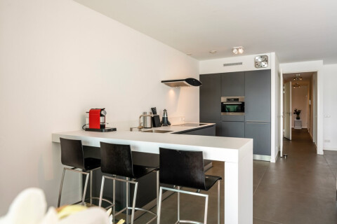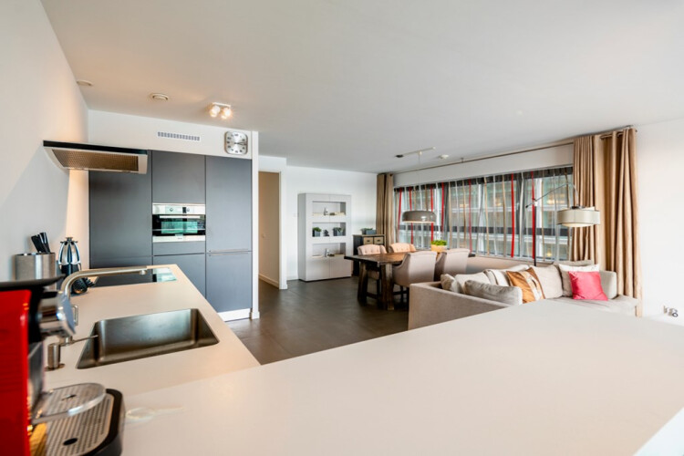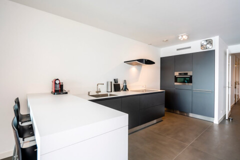 - hal, twee slaapkamers, luxe en moderne badkamer v.v. ligbad, aparte douche, brede wastafel, apart toilet, washok met wasmachine en droger, ruime woonkamer met moderne open Bulthaup keuken, schuifdeuren naar het ruime (20m2) en zonnige terras met uitzicht over de binnenstad