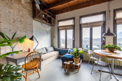 Alle woonfuncties, keuken, eettafel, zithoek en slaapkamer bevinden zich in één ruimte. Met uitzondering van de badkamer die als een ’box’ in de kamer is geplaatst. Het hoge balkenplafond, de drie grote ramen, de deels niet afgewerkte muren maken van dit appartement een bijzondere plek. Inrichting is grotendeels vintage. Het bed bevindt zich in een kast, die gemakkelijk is uit te klappen, zodat de ruimte beschikbaar blijft voor leefruimte. Door het terras met uitschuifbare overkapping en de grote hoge ramen lijkt en voelt het appartement veel ruimer dan zijn oorspronkelijke 25 m2.
