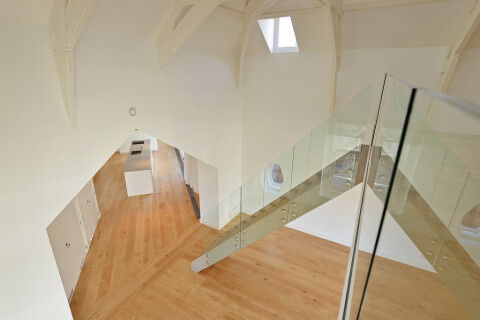 Through the kitchen access to the bright living room with windows all around and the beautiful original beam construction which creates a spacious and open feeling. In the notch a vide is created with a bedroom and ensuite bathroom.