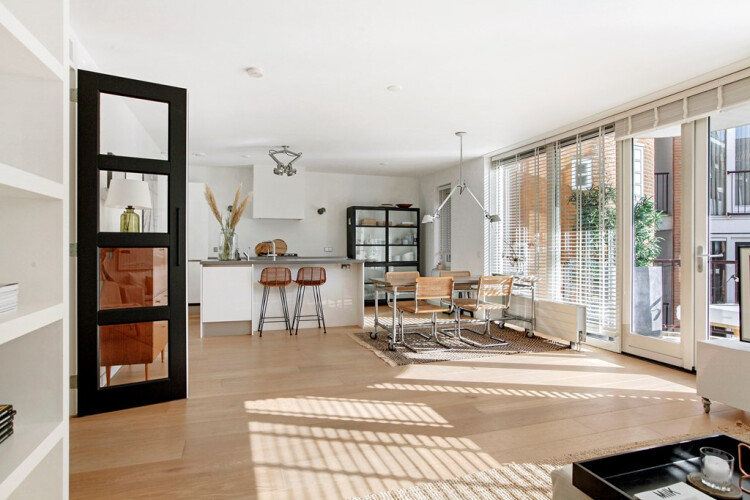 Very light and spacious three room apartment, approximately 93 m2 (1000 sqr ft) of recent build (unique in Amsterdam). The Amberhof building was finished in 2009 and is situated near the popular Maasstraat and near RAI congress-centre.