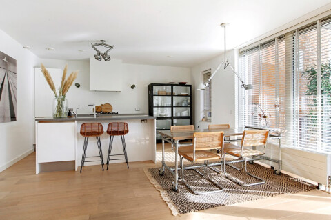 De grote, lichte woonkamer met luxe open keuken ligt aan de achterzijde en biedt toegang tot het ruime balkon met dubbele openslaande deuren. De huiskamer en het balkon geven uitzicht over de groene binnentuinen. De keuken is riant en voorzien van alle benodigde inbouwapparatuur.