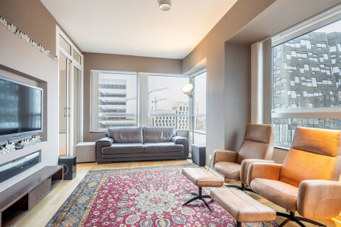 This urban apartment near the World Trade Center has 2 bedrooms, 2 luxurious bathrooms, working room (loggia), modern kitchen, swimming pool, GYM, sauna, private parking place in the underground garage and 24 hours security. It is definitely worth a visit.