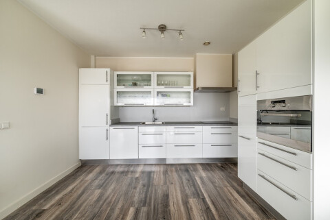 Indeling: hal, ruime woonkamer met moderne open keuken (v.v. vaatwasser, keramische kookplaat, koelkast- vriescombinatie, magnetron- oven combinatie), 2 slaapkamers, badkamer met douche, wastafel en design radiator.