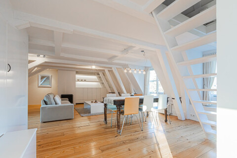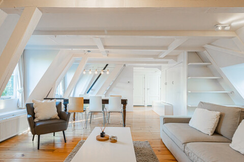 Beautiful and newly renovated furnished apartment in the middle of the famous Nine Streets shopping area, situated in a building declared national monument that boast a prestigious entree hall with elevator. The apartment is 115m2 which consist of spacious and light living room with built-in bookshelves and storage space. The living room shows the original woodwork and has all new designer lighting and a working fire place.