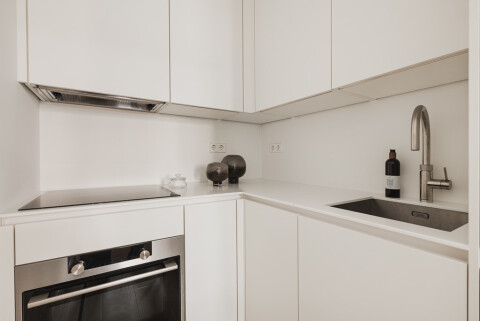Through the communal hall on the ground floor there is access to the house via a lift or the stairs. On the first floor entrance to the hall. The hall gives access to all rooms. The bright and spacious living room (three windows wide) at the front flows into the semi-open kitchen at the front of the house. The kitchen is equipped with all comforts such as a dishwasher, refrigerator, induction plate, Quooker, microwave / oven, etc. The bathroom, separate toilet and laundry can also be accessed through the hall. The bathroom has a wide sink and walk-in rain shower. Both bedrooms are located at the quiet rear and give access to the spacious balcony over the entire width of the apartment.