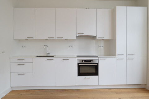 Ruime en lichte woonkamer met open keuken (v.v. diverse inbouwapparatuur), slaapkamer, badkamer met inloopdouche, toilet en wastafel. Bergkast met wasmachine en wasdroger.