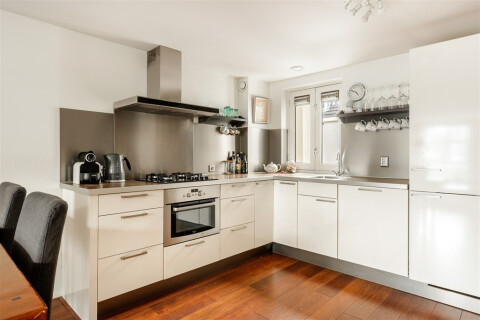 De entree brengt u naar de hal, welke toegang verleend tot de woonkamer en open keuken en balkon gelegen zuidoost. De ruime woonkamer met open keuken geeft een middels de grote raampartijen een prachtig zicht over de gracht. Voorts is de keuken voorzien van diverse inbouwapparatuur, waaronder een 4-pits gasfornuis, combi oven/magnetron, koelkast, vriezer en RVS afzuigkap.