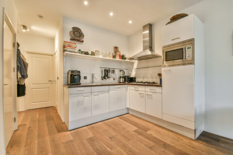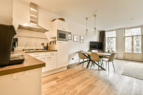 De woon-/eetkamer is voorzien van grote ramen en grenst aan de halfopen keuken. De keuken is voorzien van diverse inbouwapparatuur waaronder een gasfornuis, afzuiginstallatie, oven/magnetron combi, ijskast en vaatwasser. Daarnaast beschikt de keuken over voldoende opbergruimte en inbouwverlichting.