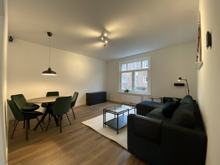 De ruime en lichte woonkamer is gelegen aan de voorzijde van de woning. De woonkamer is voorzien van een smart tv, Sonos, een grote hoekbank (slaapbank) en verlichting. Via de woonkamer verkrijg je toegang tot de grote slaapkamer met ensuite badkamer. De slaapkamer is voor zien van een groot dubbel bed, Sonos, nachtkastjes er verlichting. Ook kun je via deze slaapkamer het balkon betreden.