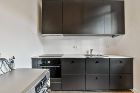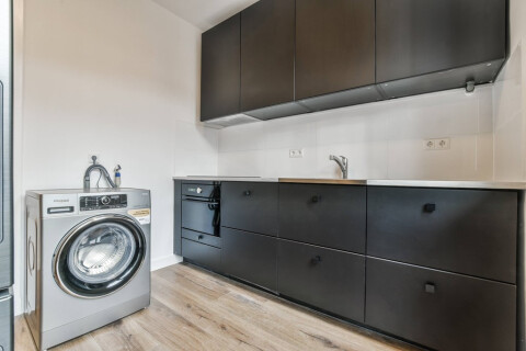 De keuken is van alle gemakken voorzien waaronder een inductiekookplaat, grote ijskast met vriezer, oven/magnetron, vaatwasser, wasmachine en voldoende opbergruimte. Via de keuken betreedt je het ruime balkon, gelegen op het zuiden.