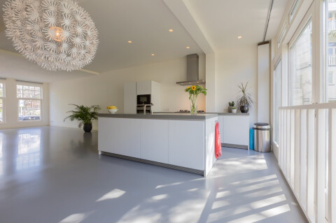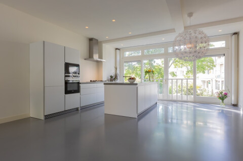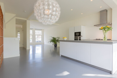 Begane grond: Eigen voordeur, gang en trap naar de bijzonder ruime woonkamer, met grote ramen aan zowel de voor- als achterzijde, zeer moderne open keuken met kookeiland
