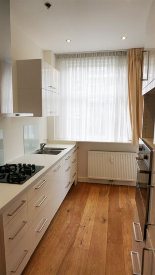 Aan de achterzijde ligt een balkon over de volle breedte van het appartement, toegankelijk vanuit zowel de woonkamer als de keuken. De woning beschikt over centrale verwarming en is voorzien van een houten vloer met vitrage en gordijnen in alle vertrekken.