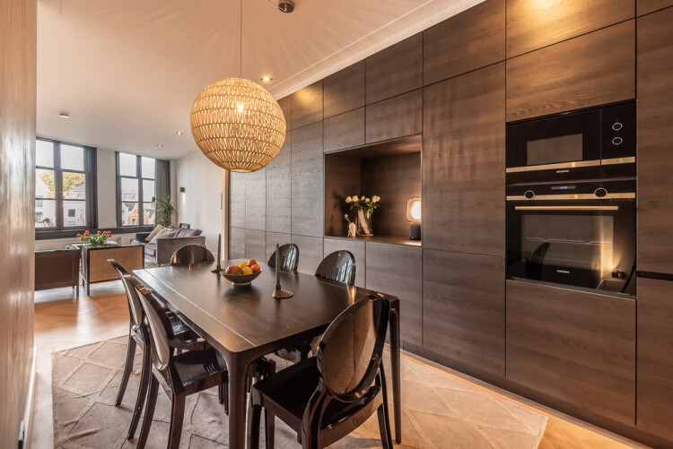 Next to the seating area you find the open-plan kitchen. It features a wide built-in cupboard / closet that reaches all the way to the bedroom in the back of the apartment. You could easily say there is more than enough storage space. The elegant kitchen includes a dishwasher, refrigerator, combi-oven, microwave, induction stove and coffee machine. Everything you need to prepare a great dish for an evening diner. The wooden table and black chairs match the area perfectly.