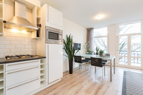 U komt binnen in de hal van het appartment, met aan uw rechterzijde woonkamer die zicht kenmerkt door veel lichtinval door de grote raampartijen. Het appartement heeft een open keuken die is v.v. diverse inbouwapparatuur zoals een koelkast met vriesvak, vaatwasser, oven, kookplaat en afzuigkap. In de woonkamer bevindt zich ook nog een Frans balkon dat uitzicht biedt op de straat. Het appartement heeft 2 slaapkamers, waarvan één voorzien van een ruim bed en tv en de ander van een zeer ruime inbouwkast. Beide slaapkamers bieden toegang tot het ruime balkon aan de achterzijde. Tevens biedt het een luxe badkamer met douche, wastafel en wasmachine. Er is hier bovendien een toilet aanwezig. Kortom een prachtig appartement op een fantastische plek in de bruisende Indische buurt in Amsterdam.