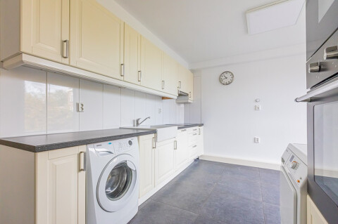 hal, ruime en moderne eetkeuken (v.v. diverse inbouw apparatuur) en wasmachine en droger, openslaande deur naar het balkon aan de achterzijde, lichte woonkamer aan de voorzijde, twee goed bemeten slaapkamers, moderne badkamer v.v. ligbad, aparte douche, dubbele wastafel, toilet.