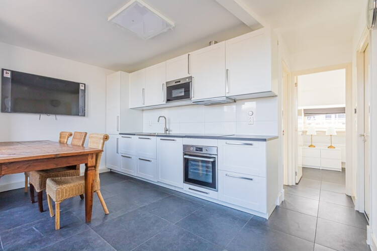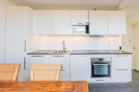 hal, ruime en moderne woonkeuken (v.v. diverse inbouw apparatuur), openslaande deuren naar het zonnige terras, twee goed bemeten slaapkamers, moderne badkamer v.v. ligbad, aparte douche, wastafel, toilet, wasmachine en droger. Aparte 2e toilet.