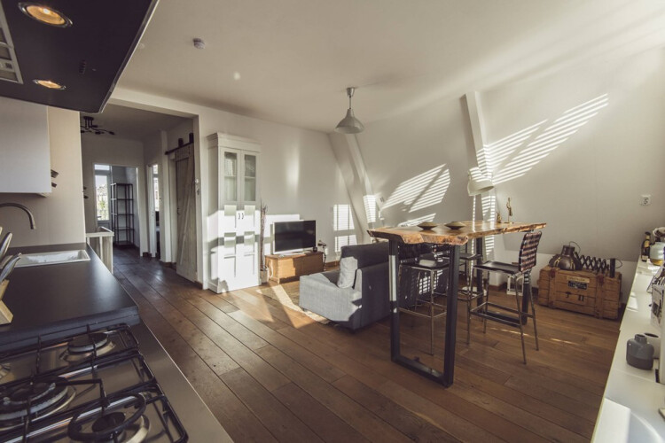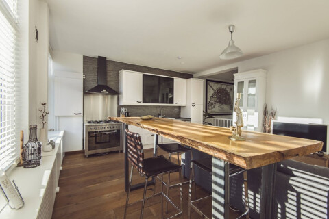 Dit prachtige appartement is uitstekend ontworpen met uw comfort in gedachten. Een uitnodigende woonruimte met authentieke houten vloeren en heerlijk eigentijds meubilair. De elegante eettafel en hoge stoelen zorgen ervoor dat u comfortabel kan genieten as er vrienden langskomen voor het avondeten. De keuken is uitgerust met een mooie 5-pits gasfornuis met een grote oven.