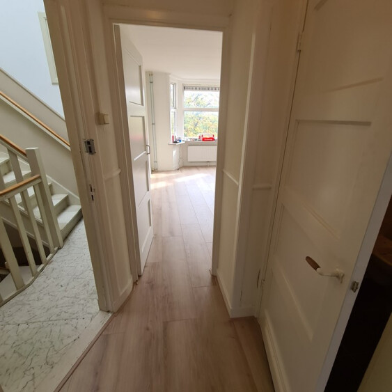 Groot appartement met 2 slaapkamers waarvan 1 normale slaapkamer en een kleine slaapkamer en boven nog een zolderkamer voor gasten. Woonkamer en suite ook geschikt als eetkamer gedeelte of study. Houten vloer nieuw. Nieuwe keuken. Gerenoveerd. Badkamer me douche, apart toilet. Balkon aan de achterkant. Vrij uitzicht op speel plein met een gezellige kleine supermarkt. Er is ook een zolderkamer voor gasten . Maximaal 2 personen stel of familie met kinderen. Geen delers toegestaan. Park om de hoek.