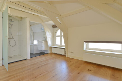 Through the kitchen access to the bright living room with windows all around and the beautiful original beam construction which creates a spacious and open feeling. In the notch a vide is created with a bedroom and ensuite bathroom.