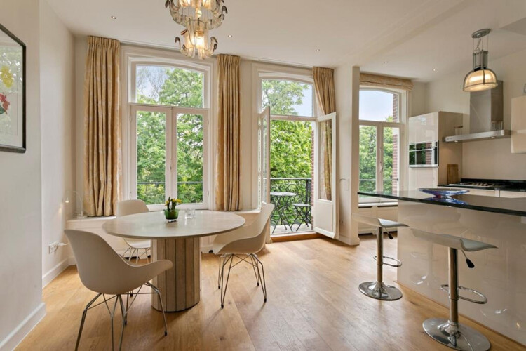 This apartment with balcony on the park side has large windows, so the light is pouring in from front to back.