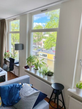 A well maintained flight of stairs leads you to the second floor of the building. You enter in a open hallway which gives direct access to all the rooms in the apartment.  The living room is situated at the front and the comfortable window sill offers you the perfect spot to enjoy the view of the canal. The open kitchen is fully equipped with all needed appliances like a dish washer.