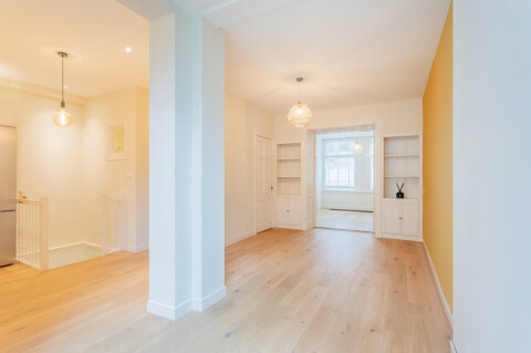 Beautifully renovated ground floor house of approx. 95m2 located on private ground with a sunny garden of approx. 63m2. This charming home was renovated with a great eye for the original details. The dining and living areas are located at the sunny back where you can find a spacious garden facing south. The apartments has 2 generous bedrooms.